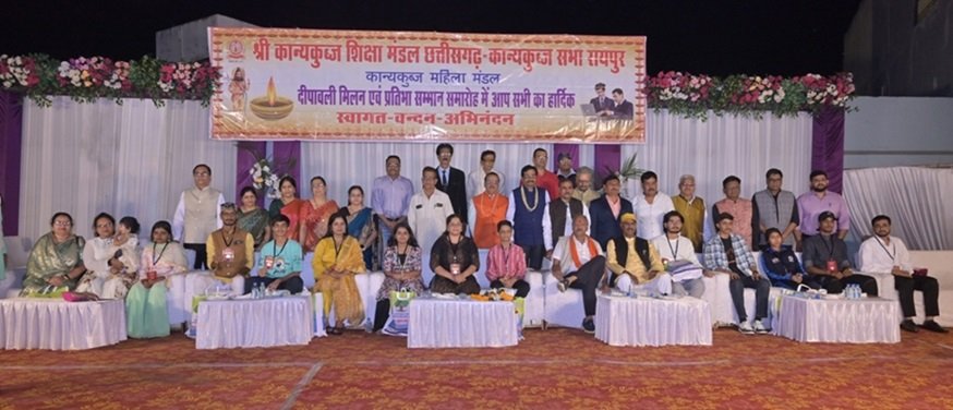 रायपुर (प्रदेश रौनक)। कान्यकुब्ज ब्राह्मण समाज ने 13 नवंबर को आशीर्वाद भवन में भव्य दीपावली मिलन एवं प्रतिभा सम्मान समारोह का आयोजन किया। इस अवसर पर समाज के प्रतिभावान छात्र-छात्राओं को गोल्ड एवं सिल्वर मेडल से अलंकृत किया गया। कक्षा 10 वी में अशिन्द्रपाठक एवं तनिष्का मिश्रा और कक्षा 12वी में राजगौरव शुक्ल एवं ऋषिका पाठक को गोल्डमेडल से सम्मानित किया गया| पं. मुन्ना लाल शुक्लस्मृति आशीर्वाद हायर सेकेंडरी इंग्लिश स्कूल में शुक्ल की प्रतिमा का अनावरण व आशीर्वाद भवन में लिफ्ट का लोकार्पण मुख्य अतिथि प्रो. डॉ. मुकेश पाण्डेय (कुलपति बुंदेलखंड विश्वविद्यालय झांसी उ. प्र.) अध्यक्षता डॉ. अनिल दीक्षित (संयुक्त संचालक – सी.एच.एम.आर.), विशिष्ट अतिथि पं. महेश मिश्रा (राष्ट्रीय महामंत्री अ भा कान्यकुब्ज ब्राह्मण महासभा कानपुर) ने किया। कार्यक्रम संचालन राघवेन्द्र मिश्र ने सचिवीय प्रतिवेदन पठन के लिए सचिव को आमंत्रित किया