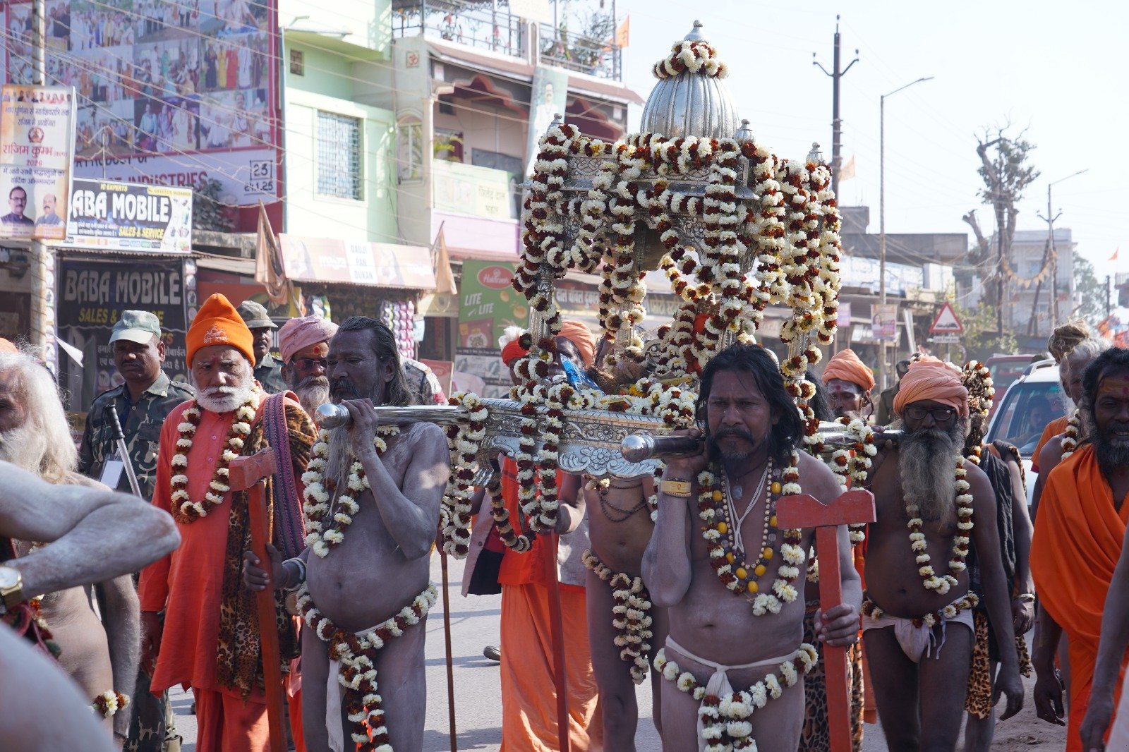 राजिम। राजिम कुंभ कल्प मेला के दौरान धर्म नगरी राजिम में नागा साधुओं ने भव्य पेशवाई निकाली, जो सनातन परंपरा का साक्षी बना। नागा साधुओं द्वारा भस्म रमाएं, जटा लहराते और पारंपरिक अस्त्र-शस्त्र धारण किए इस जुलुस ने पूरे नगर को हर-हर महादेव के जयघोष से गुंजायमान कर दिया।